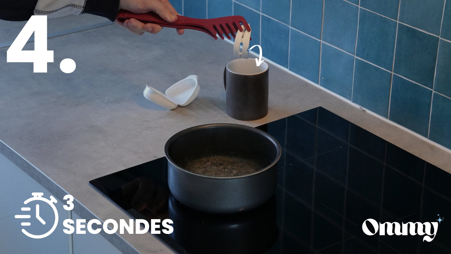 Utilisez la pince pour retirer l’orthèse de la casserole, puis plongez-la rapidement dans le mug d’eau froide afin d’éviter de vous brûler.