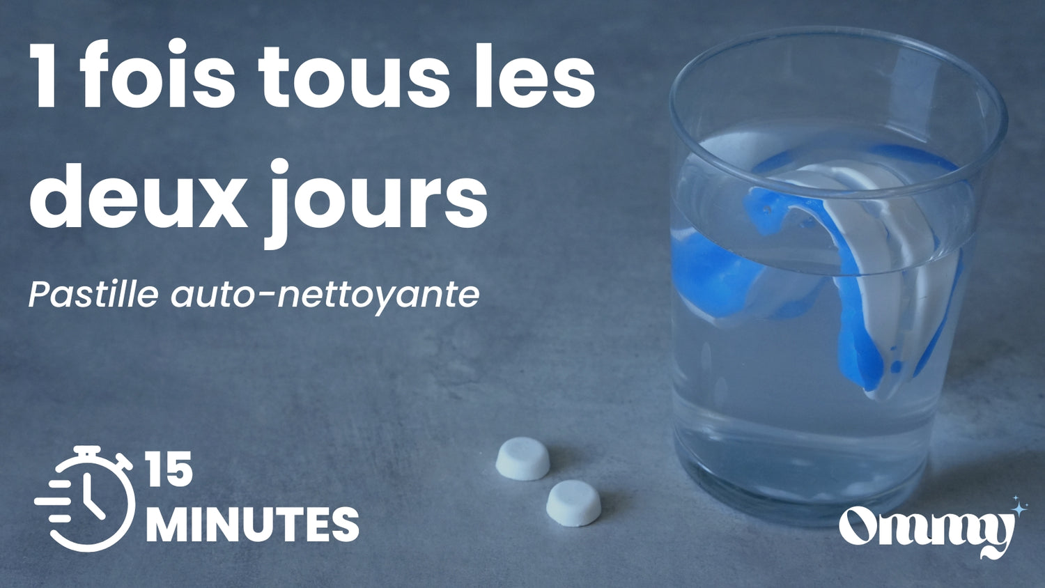 Dissolvez une pastille dans un verre d’eau tiède, puis laissez votre orthèse tremper pendant 15 minutes.